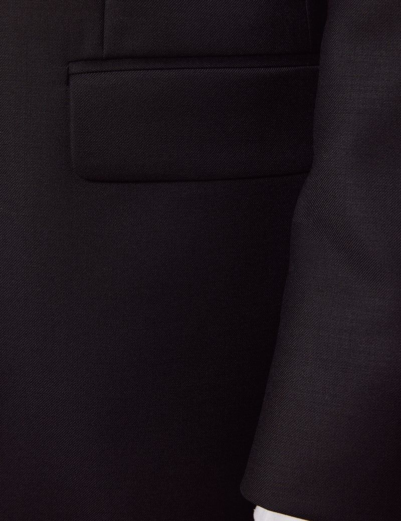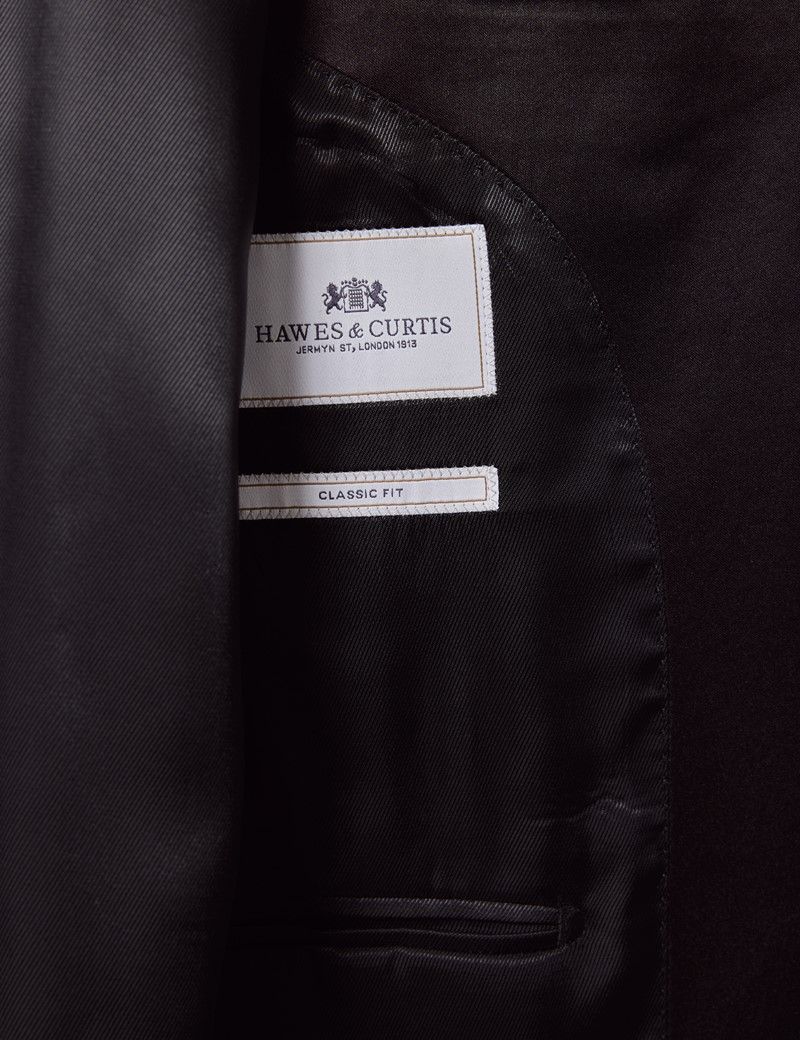 Make a lasting impression with this timeless black two-piece dinner suit, perfect for exuding style and sophistication. Crafted with meticulous attention to detail, this ensemble is fashioned from super 100s wool. The jacket is designed with a single-breasted two-button front and features elegant satin peak lapels. Refined details include contrast satin trim lapels and smooth fabric buttons. Pair it with a crisp white evening shirt or a polished print for a confident and attractive look every time you wear it.