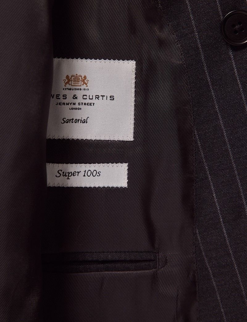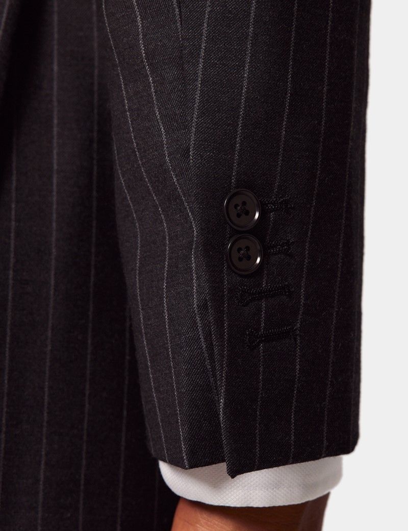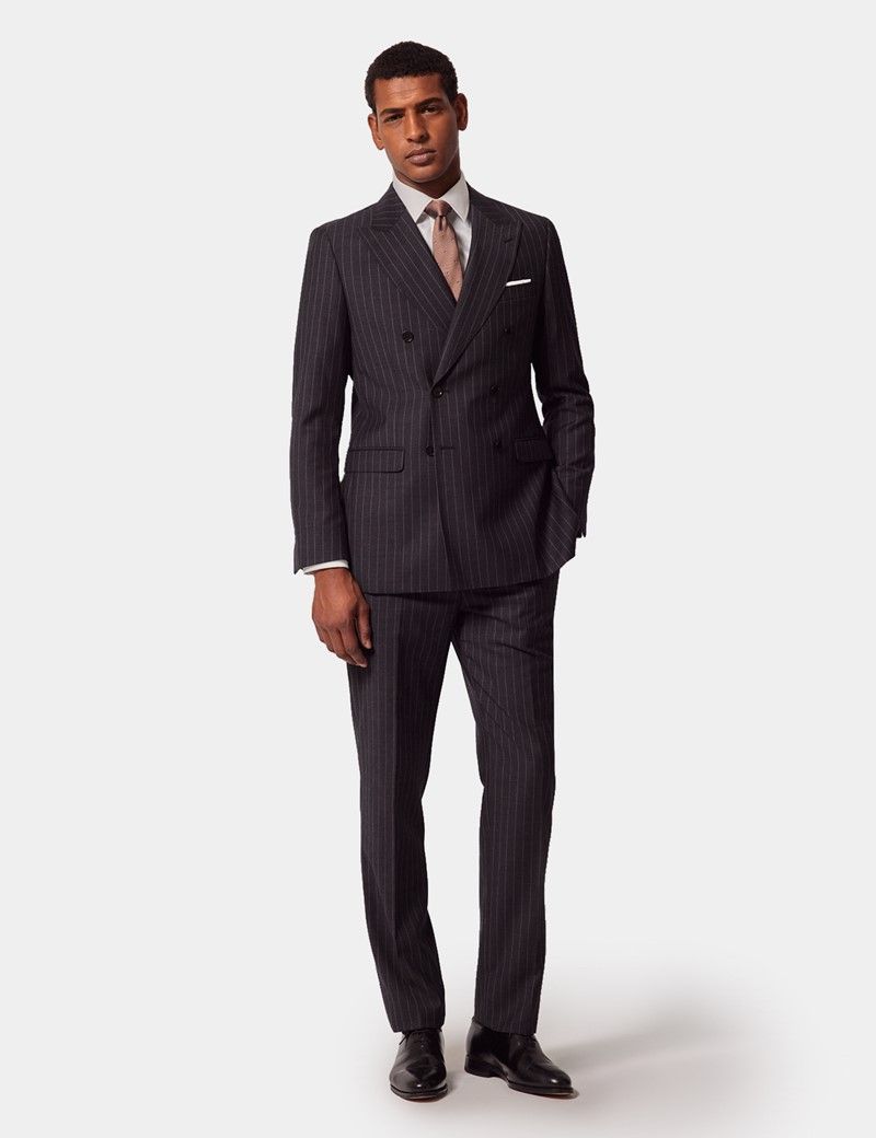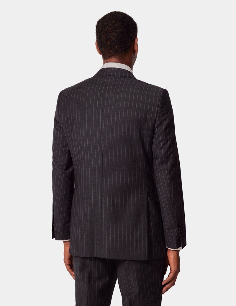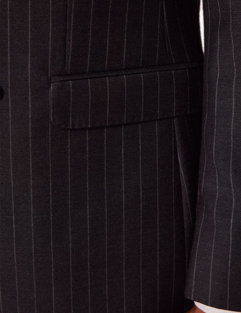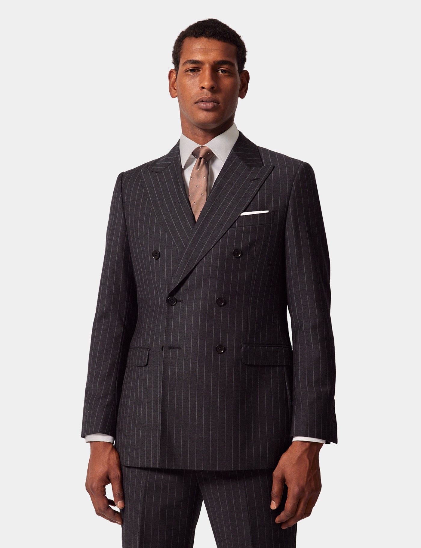 Put your trust in this charcoal double-breasted two piece suit made from the finest super 100s wool. The lined, double-breasted jacket is designed with a classic chalk stripe pattern and peak lapels with six front buttons. The elegant double vents enable freedom of movement. This slim-fit suit has a tailored silhouette for a modern style that will flatter everyone.