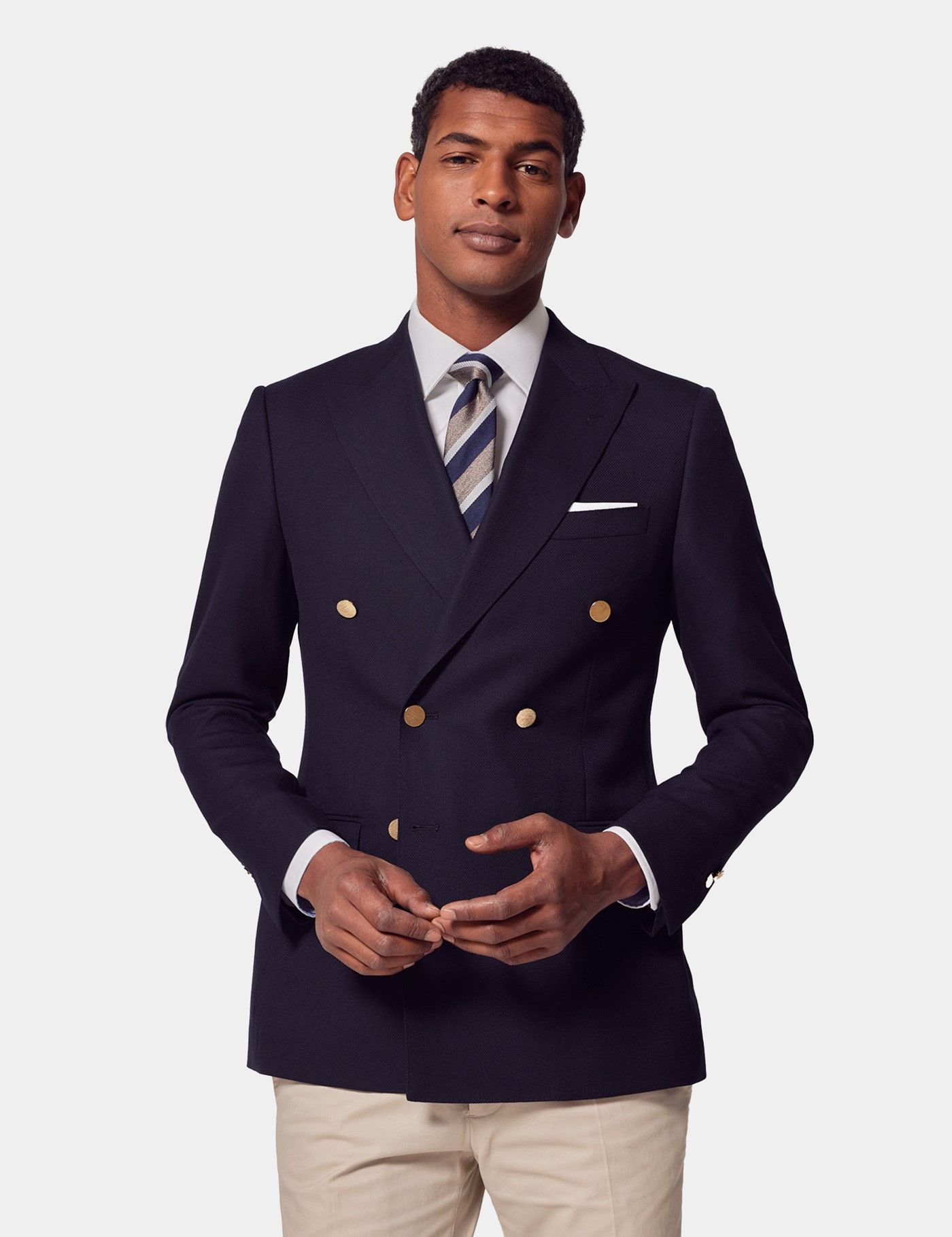 This timeless blazer is crafted from the finest super 100s pure wool. The double-breasted design features a luxurious textured weave, gold-toned buttons and peak lapels. A truly versatile piece you can style with tailored trousers for a sleek look.