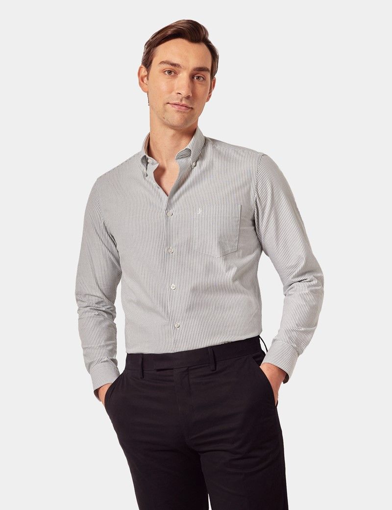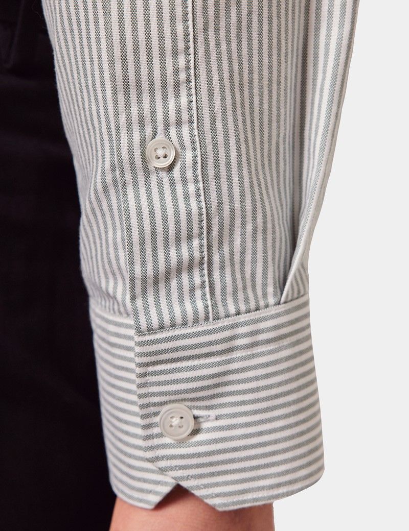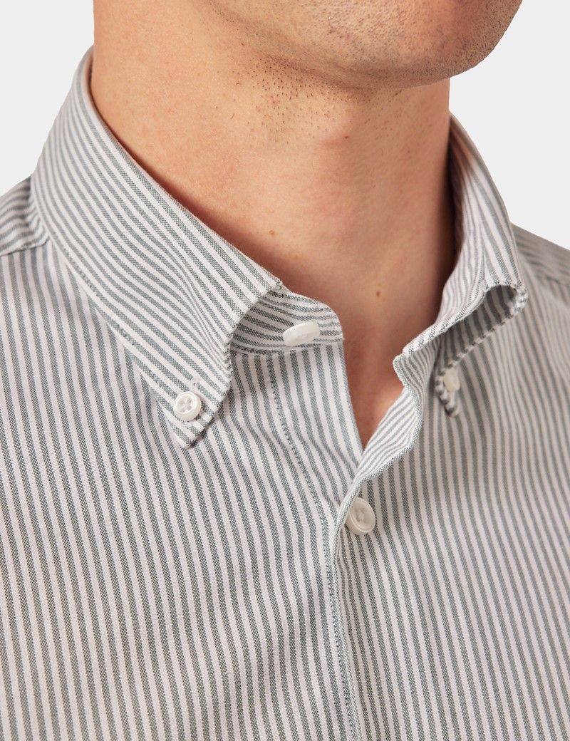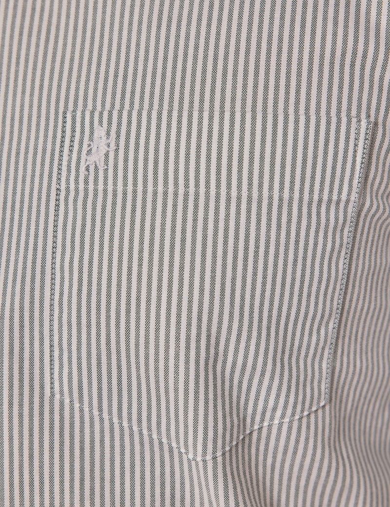 Introduce this green and white oxford shirt to your collection for an air of refinement. Made from high-quality cotton in a basketweave, this striped shirt offers superior comfort and breathability, ideal for both formal and casual occasions. Its classic design features a staple button-down collar and chest pocket with a subtle lion embroidery. Adding a touch of sophistication to any ensemble, the regular fit ensures a flattering silhouette for all body types.