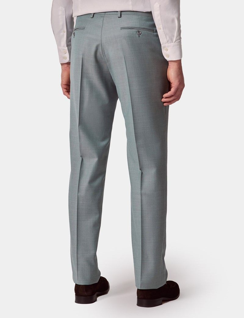 Complete your wardrobe with this charming green sharkskin suit, made in the finest super 130s pure Italian wool from the famous Lanifico Zignone mill. Woven in a smooth sharkskin weave, you can anticipate an undeniably sleek appearance with a premium feel. The lined, single breasted jacket is designed with a classic notch lapel, two front buttons and smart double vents to enable freedom of movement.
