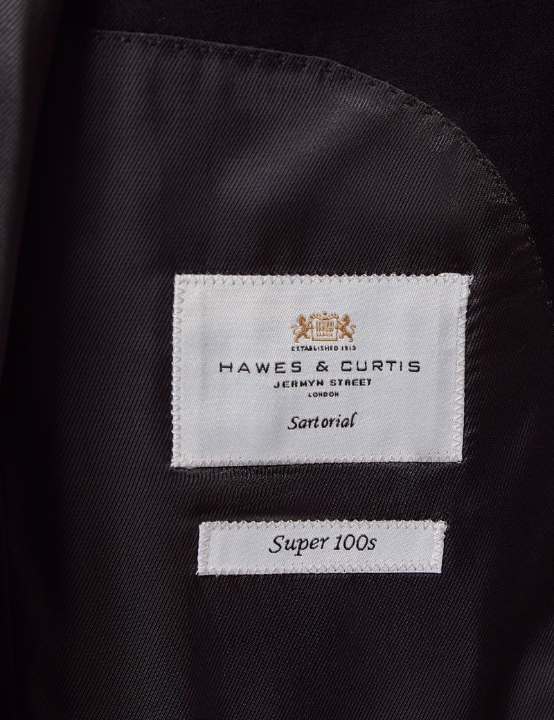 This exquisite black classic fit suit is made from the finest super 100s wool and it features a subtle twill weave. The lined, single breasted jacket is designed with a classic notch lapel with two front buttons. The elegant double vents enable freedom of movement. Finer details include a felt lining under the collar of the jacket, genuine corozo nut buttons and working button cuffs. This slim fit suit has a tailored silhouette for a modern style that will flatter everyone.