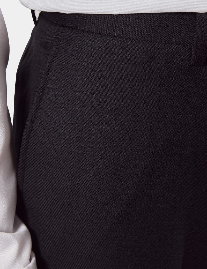 Upgrade your staple suiting with this black two-piece suit made from the finest super 100s pure wool. The lined, single-breasted jacket is designed with a classic notched lapel with two buttons. It has a welt breast pocket and two straight pockets on either side with flaps. The double vents facilitate freedom of movement. This is an elaborate weave with a distinct diagonal line of raised fabric. Twill cloths are more substantial and have a smoother, silkier finish.