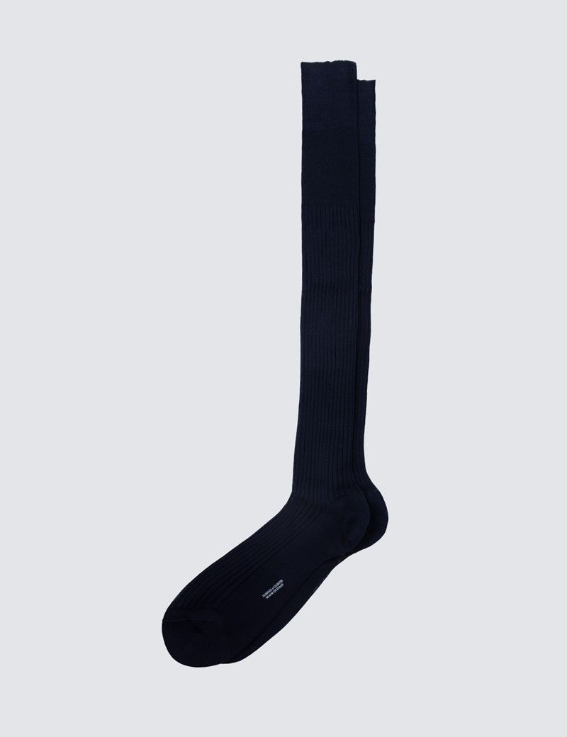 Perfectly match your socks to your trousers with a pair of these cotton long dress socks. Made in 100% cotton fabric, these smart socks have guaranteed comfort and durability. A perfect colour match for any of your navy trousers, these socks will match with a range of your smart footwear.