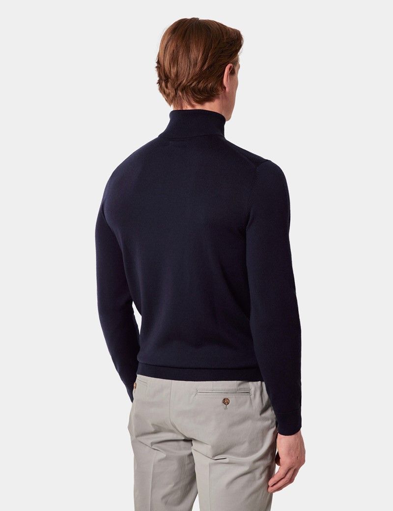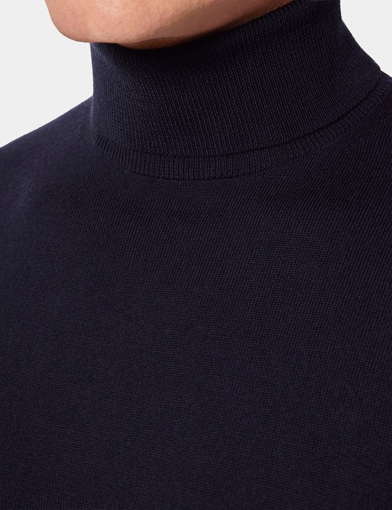 Made from smooth merino wool, this luxurious roll-neck sweater is inspired by the 60s mod style. This navy smart sweater is designed with a ribbed turtleneck, ribbed cuffs and a ribbed hem. Wear yours underneath a blazer – it will make a suave alternative to a shirt for autumn/ winter.
