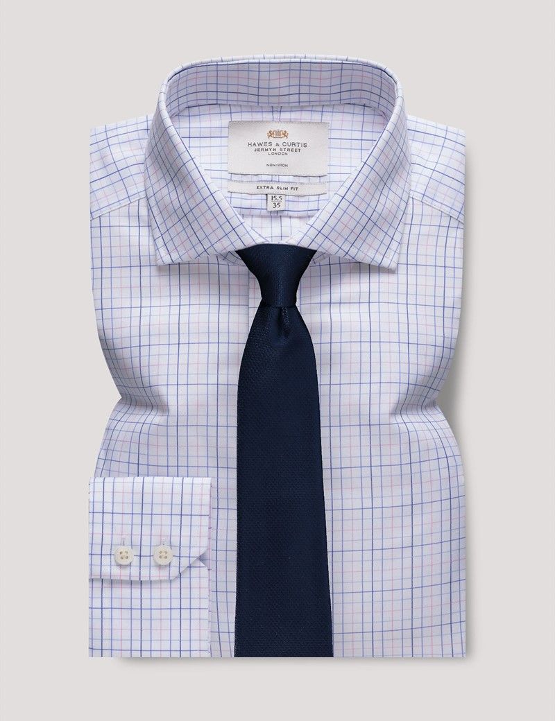A fashionable blue and pink multi check and extra slim fit shirt that is very closely cut to the body, creating a streamlined silhouette. The Windsor collar was specifically designed by Hawes & Curtis to accommodate the Duke of Windsor’s ties for a flawless finish.