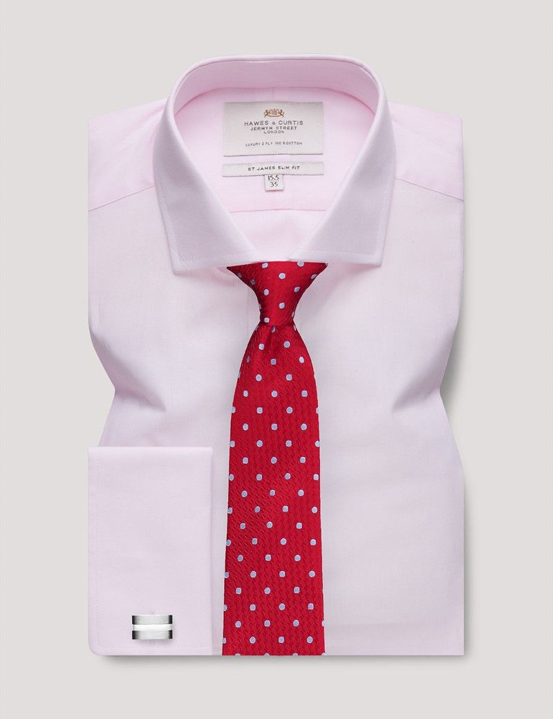 For a formal edge, this pink end-on-end shirt features double cuffs and a full cutaway collar, also known as the Windsor Collar. The Windsor collar was specifically designed by Hawes & Curtis to accommodate the Duke of Windsor’s ties. This shirt is made from the finest 2-ply 100s cotton which has been perfected with our unique silk touch finish. The slim fit is gently tapered at the waist for a relaxed, contemporary silhouette.