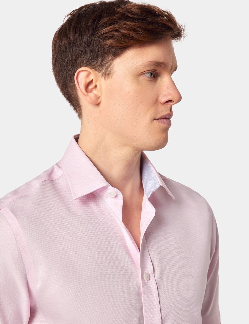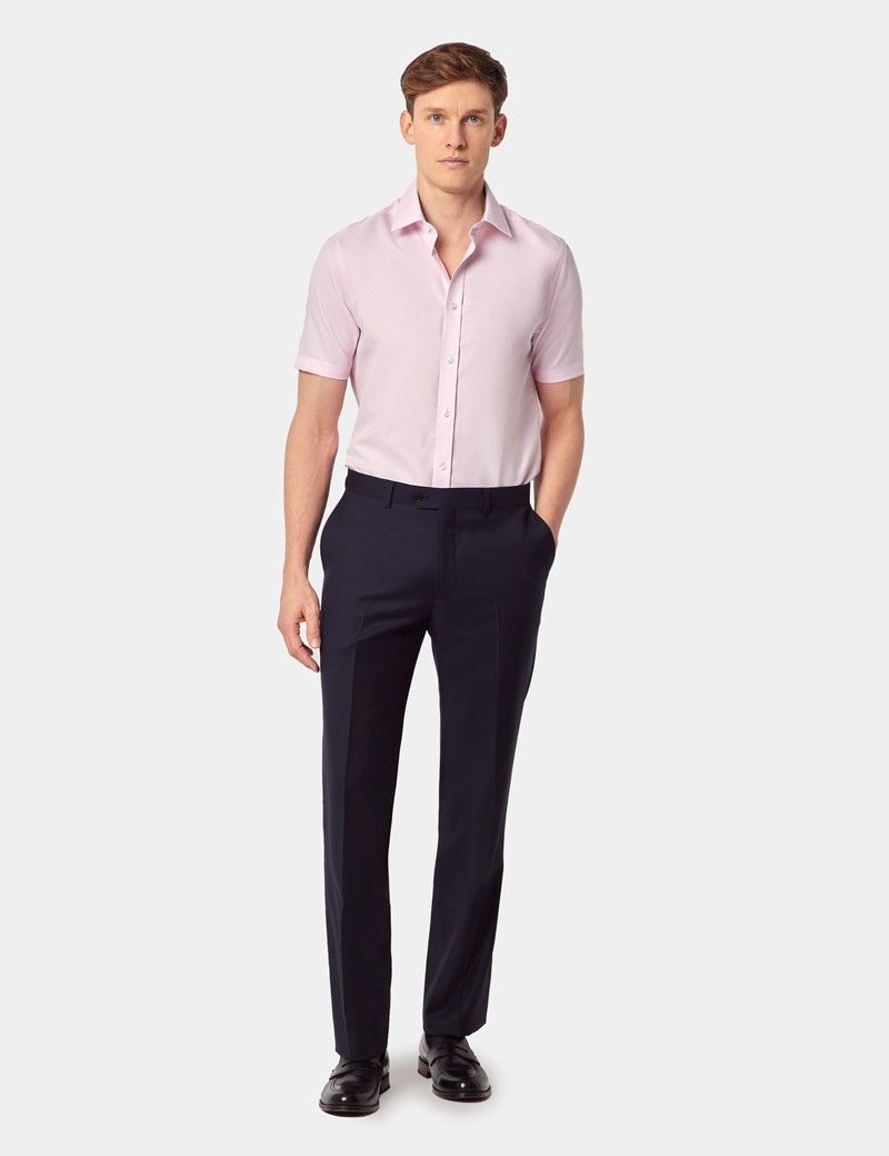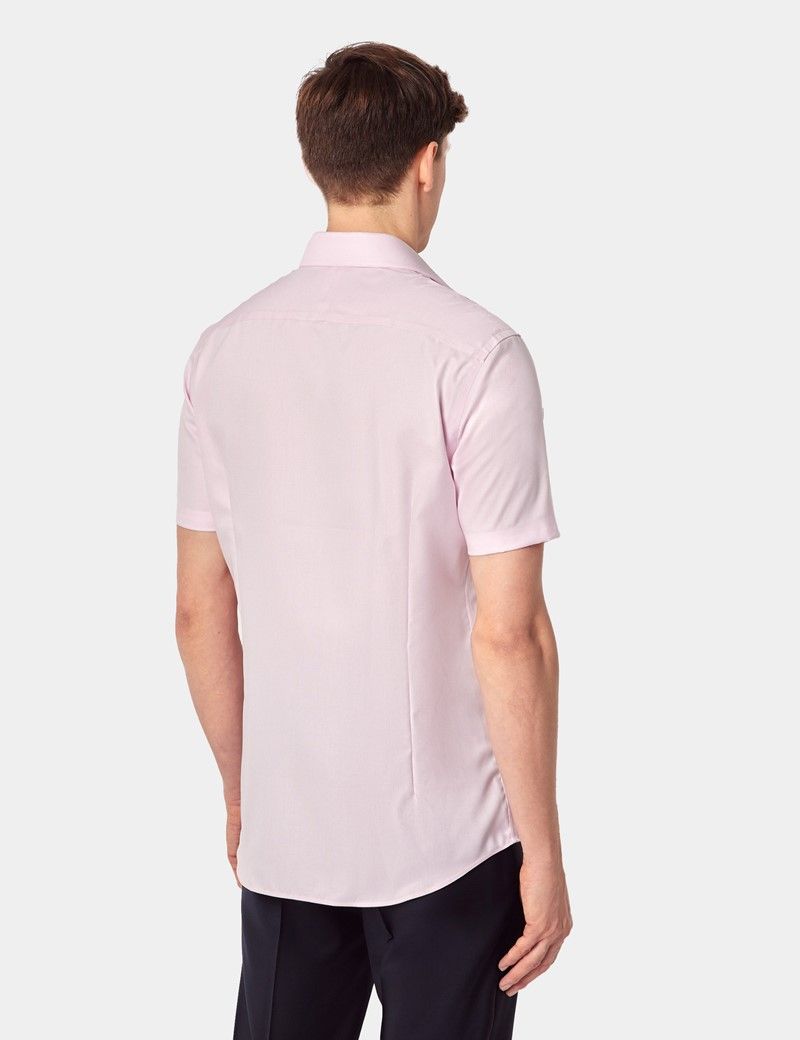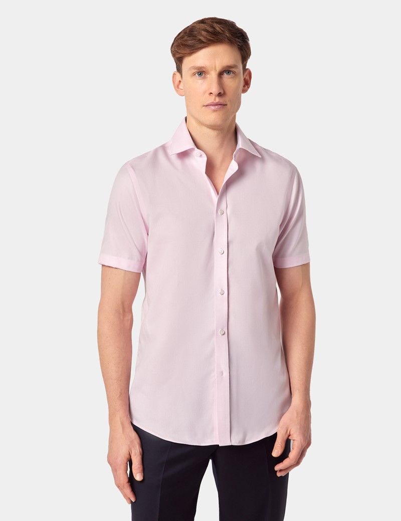 Crafted from high-quality cotton woven with a textured finish, this pink shirt offers a crisp, lightweight feel with short sleeves perfect for warmer days. The slim fit silhouette ensures a tailored look that pairs seamlessly with both casual and formal attire, making it a versatile essential for any occasion.