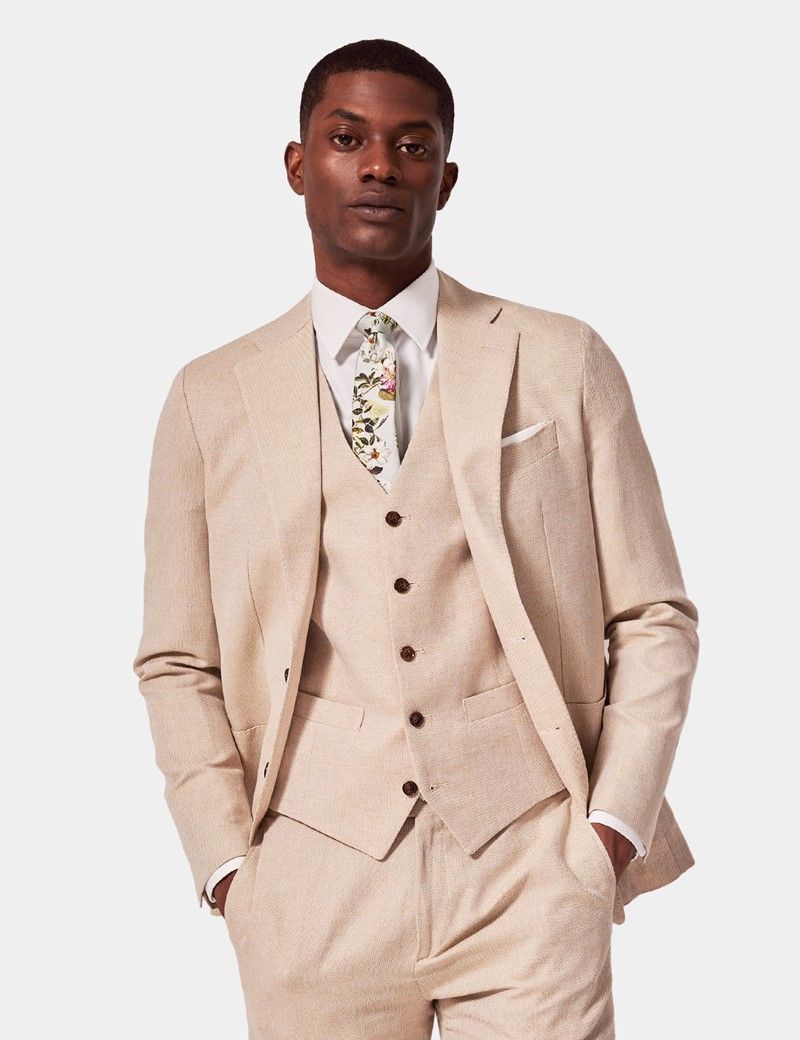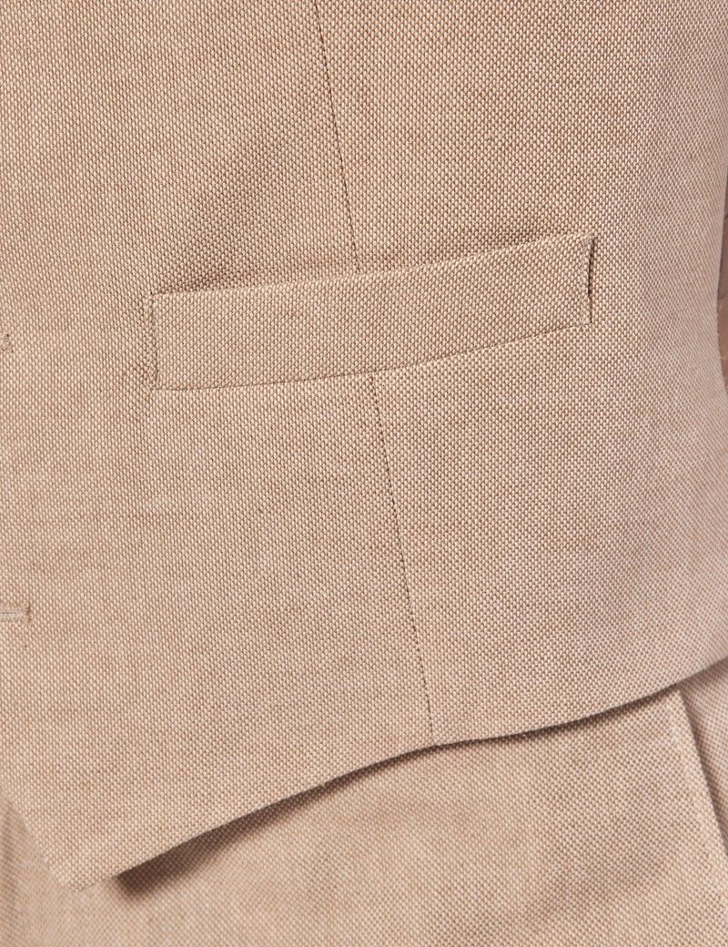 Create a stylish three piece suit with this slim fit stone waistcoat. This sartorial essential is woven in Italy from a luxurious cotton linen blend. The single breasted waistcoat features five button fastenings, two welt pockets, a contrast back and a waist adjuster to the reverse.